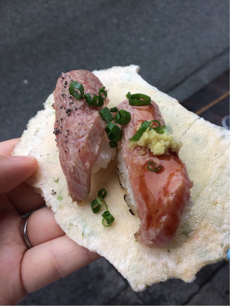 ↑飛騨牛寿司とメンチカツ
